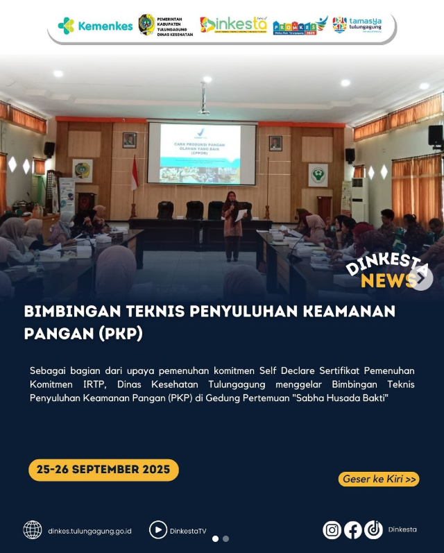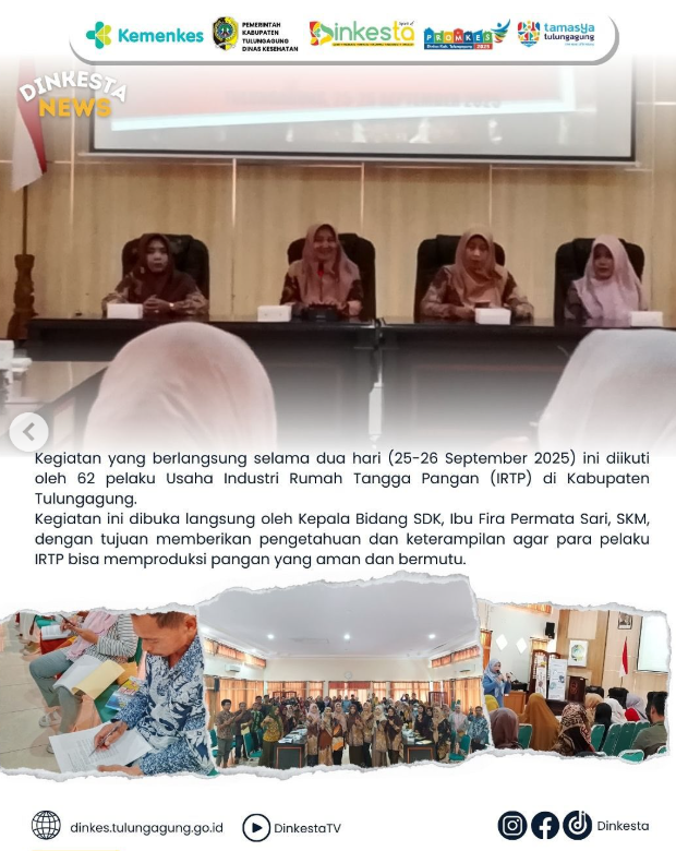 Dinkesta, Sebagai bagian dari upaya pemenuhan komitmen Self Declare Sertifikat Pemenuhan Komitmen IRTP, Dinas Kesehatan Tulungagung menggelar Bimbingan Teknis Penyuluhan Keamanan Pangan (PKP) di Gedung Pertemuan “Sabha Husada Bakti”, Dinas Kesehatan Kabupaten Tulungagung. Kegiatan yang berlangsung selama dua hari (25-26 September 2025) ini diikuti oleh 62 pelaku Usaha Industri Rumah Tangga Pangan (IRTP) di Kabupaten Tulungagung.